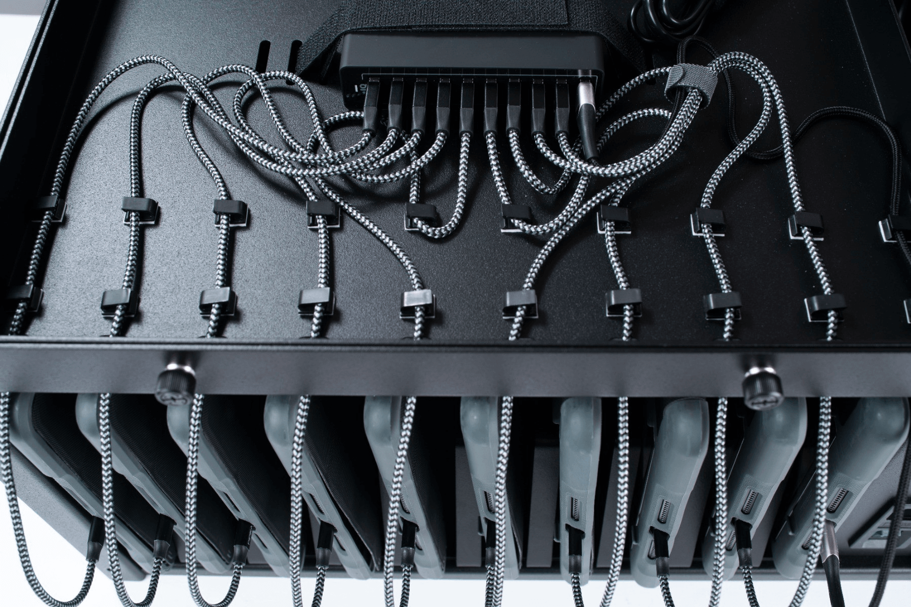 De laptops worden tegelijkertijd gecontroleerd opgeladen.