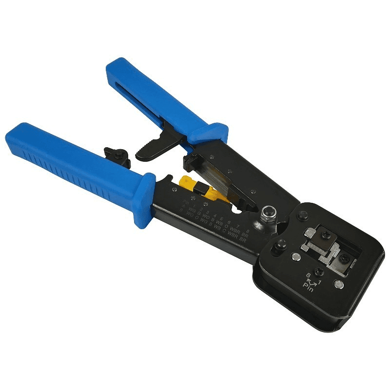 Om pass through RJ45 connectoren aan een netwerkkabel te bevestigen, heb je een krimptang nodig. Deze krimptang drukt de connector dicht en knipt de overtollige draad achter de doorsteek connector automatisch af.